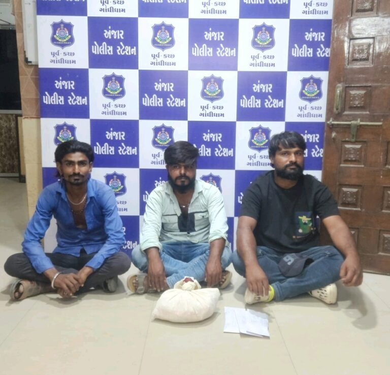 પૂર્વ કચ્છ એસઓજીએ આ રેડ દરમિયાન આરોપી આદમ ઉર્ફે અધુડો ઉર્ફે અધુ હારૂન બાફણ ઉ.વ.૩૨, અલ્લારખા જુસબ નોડે ઉ.વ ૨૧, મોહમદ અબ્દુલ કકલ ઉ.વ ૨૦ રહે.ત્રણેય શેખટીંબા ગરાસીયા ફળીયુ અંજારને ગાંજો વજન ૪૯૨ ગ્રામ કિંમત રૂપિયા ૪,૯૨૦, મોબાઈલ ફોન નંગ-૦૩ કિંમત રૂપિયા ૨૦,૦૦૦, એક મોટરસાયકલ કિમત રૂપિયા -૧,૦૦૦૦૦, રોકડા રૂપિયા ૪૧૫૦ મળી કુલ રૂપિયા ૧,૨૯,૦૭૦નો મુદ્દામાલ કબ્જે કરી કાયદેસરની કાર્યવાહી હાથ ધરી હતી.