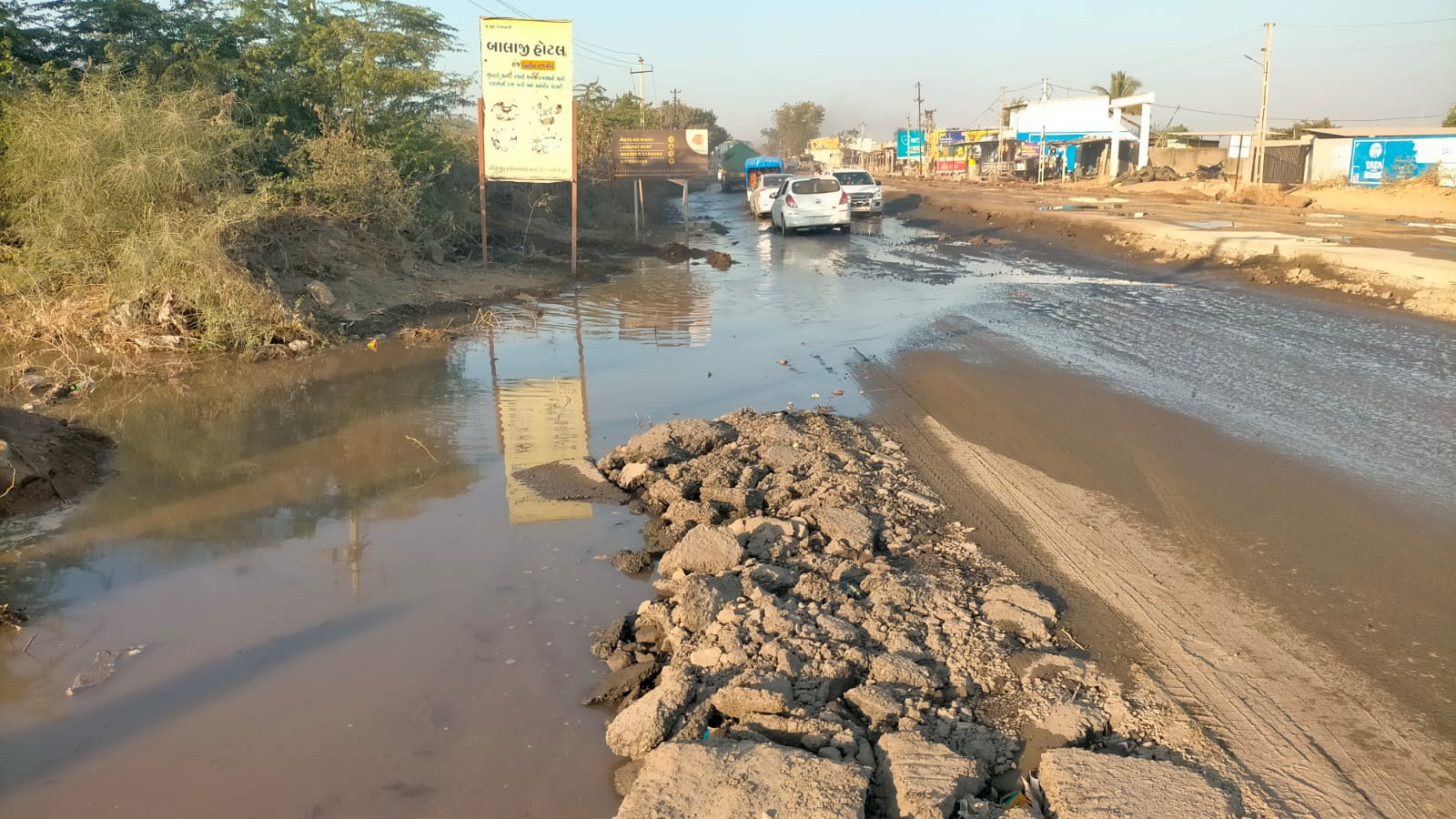 હાલ સી.સી.રોડનું કામ ચાલુ હોવાથી આ રોડ સિંગલપટી છે અને તેમાં નર્મદાની પાણી લાઇનમા બે દિવસ થયા ભંગાણ પડતા રોડપર પાણી ભરાયા હતા. તેમજ રોડપર પડેલા ખાડાઓમાં પાણી ભરાતા નાના મોટા વાહનો ખાડાઓમાં ખાબકે છે. તેમાં દ્વિચક્રી નાના વાહનો ખાડામાં પડતા એની હાલત કફોડી બની જતી હોય છે. આમ તંત્રની બેદરકારીને લીધે નાના મોટા વાહનચાલકો હાલાકીનો ભોગ બની રહ્યા છે. આ રોડપરથી સાંધી સિમેન્ટ ભરીને મોટા ટ્રેલરોની અવરજવર ઘણી હોવાના કારણે હાલ આ બે પરિસ્થિતિના કારણે નાના વાહન ચાલકોને પ્રસાર થવું એટલે અભિમન્યુનો સાતમો કોઠો જીતવો બરાબર છે.